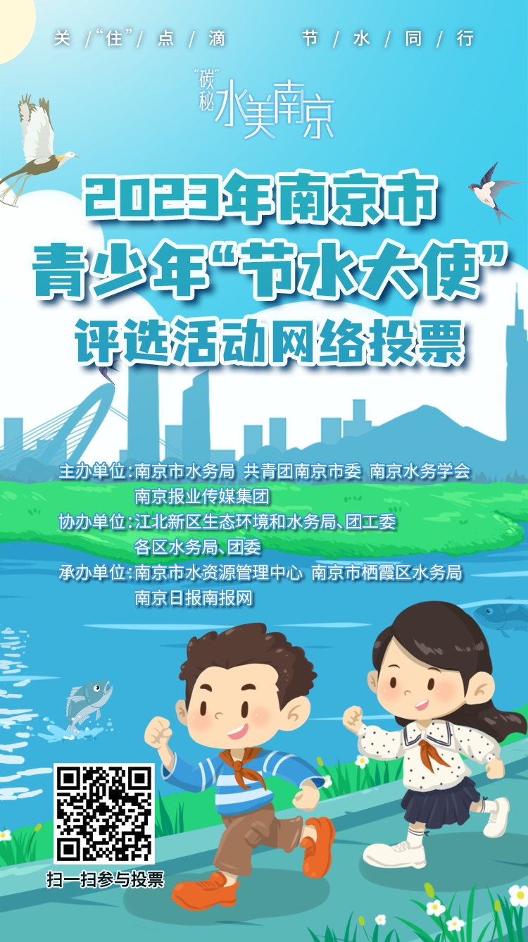 为落实水利部2023年节约用水工作要点及南京市政府“建设更有风景气度的生态南京”的决策部署,宣传展示南京水资源保护和节约用水成果,推动构建“人人参与 人人受益”的节水教育体系,营造全社会“知水亲水节水护水”的良好风尚。南京市水务局、共青团南京市委、南京水务学会、南京报业传媒集团联合开展2023年度“碳”秘水美南京暨南京市青少年“节水大使”评选活动。