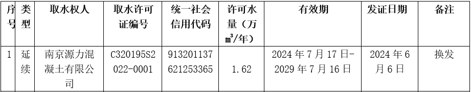 关于南京源力混凝土有限公司取水许可证延续情况的公告