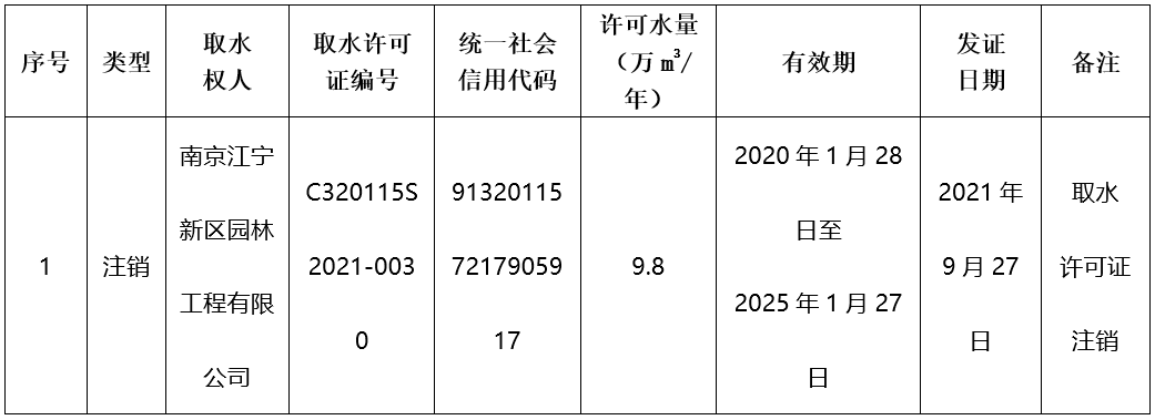 关于南京江宁新区园林工程有限公司取水许可证注销情况的公告