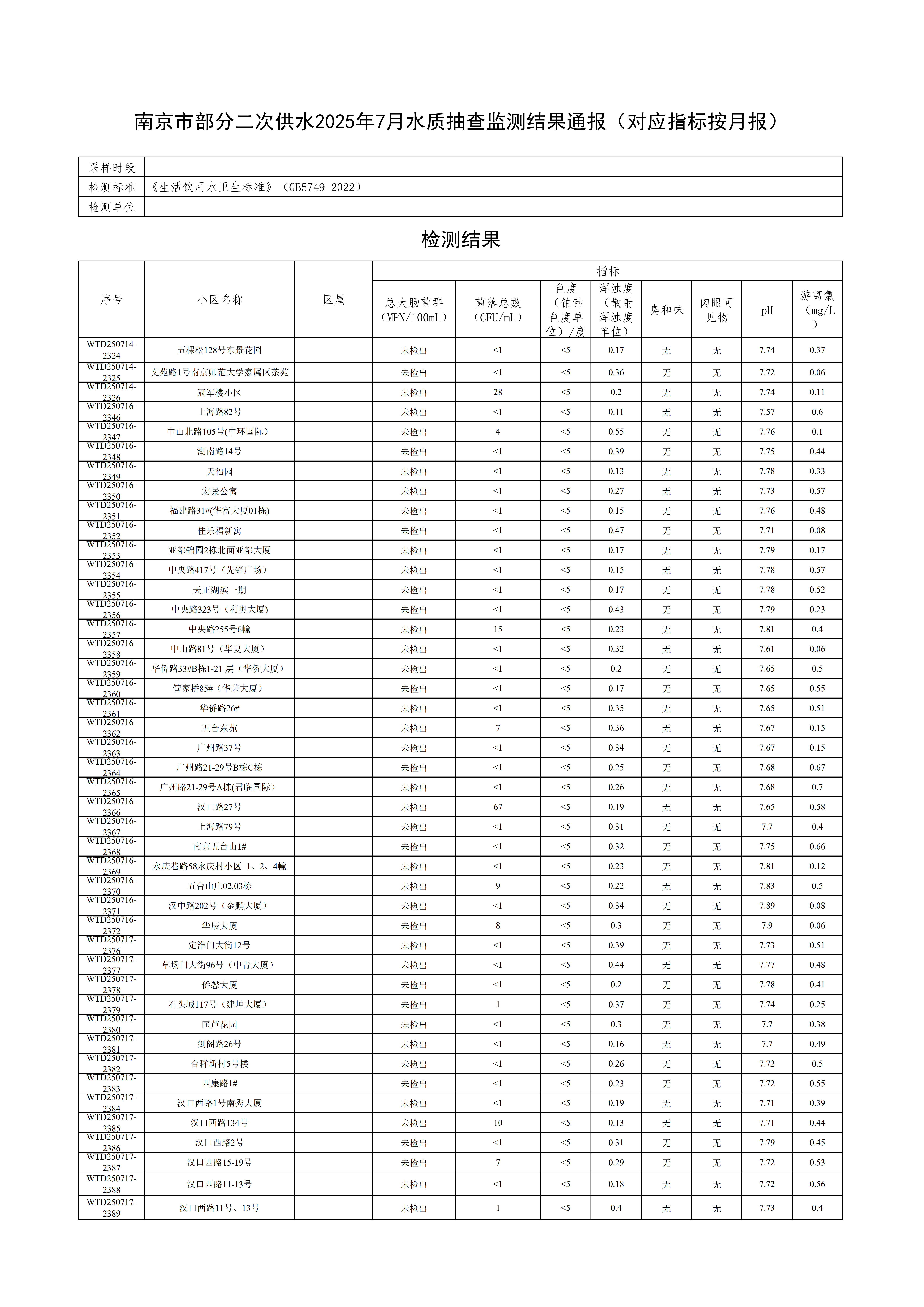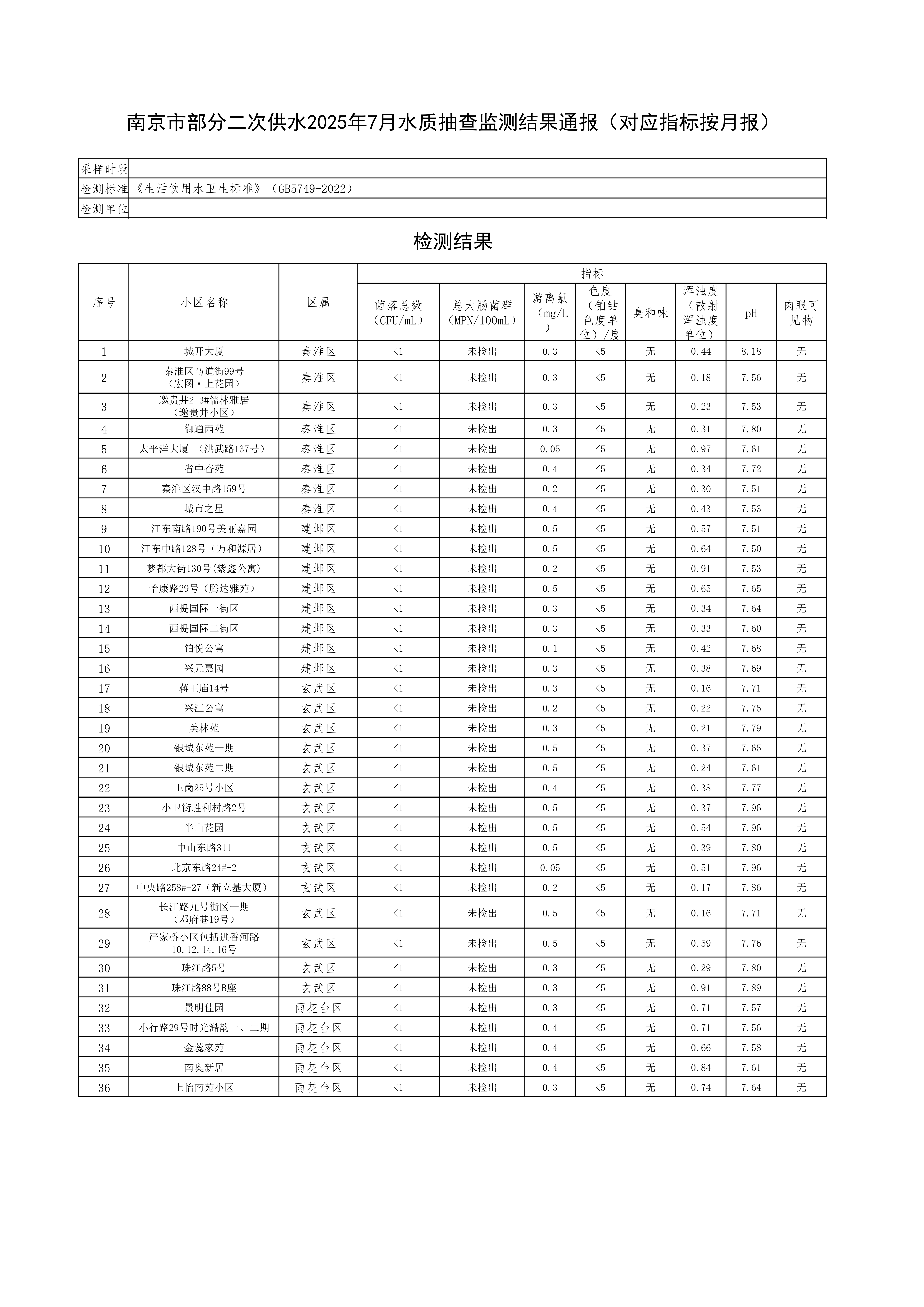 南京市部分二次供水2025年7月水质抽查监测结果通报(对应指标按月报)