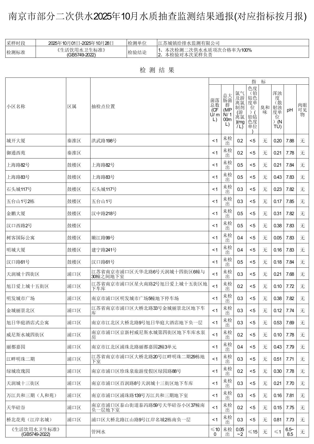 南京市部分二次供水2025年10月水质抽查监测结果通报(对应指标按月报)