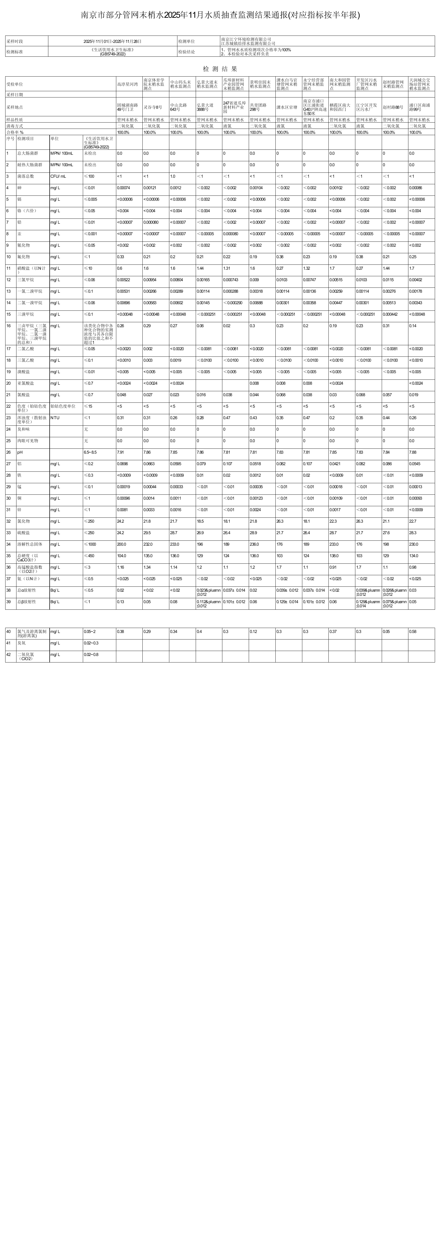南京市部分管网末梢水2025年11月水质抽查监测结果通报(对应指标按半年报)